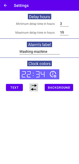 ►The clock colors, the alarm label and the time interval for deferred programming can be set.