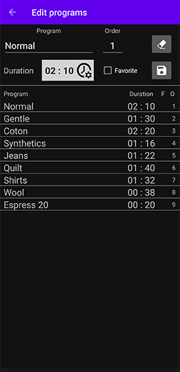 ►Wash programs can be sorted by clicking on the header text of the columns: by name, order or duration.
